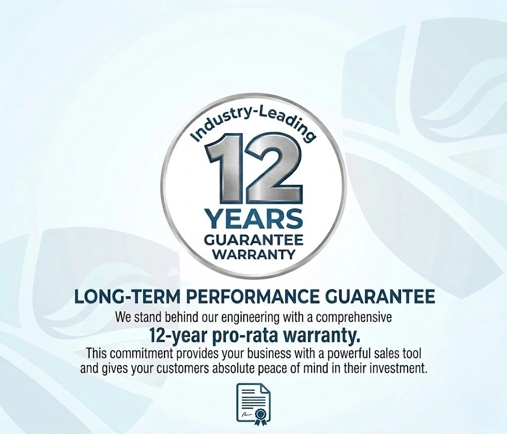 We stand behind our engineering with a comprehensive 12-year pro-rata warranty. This commitment provides your business with a powerful sales tool and gives your customers absolute peace of mind in their investment.